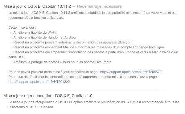 Apple propose au téléchargement une nouvelle mise de El Capitan en version 10.11.2 qui devrait améliorer un certain nombre de points :
